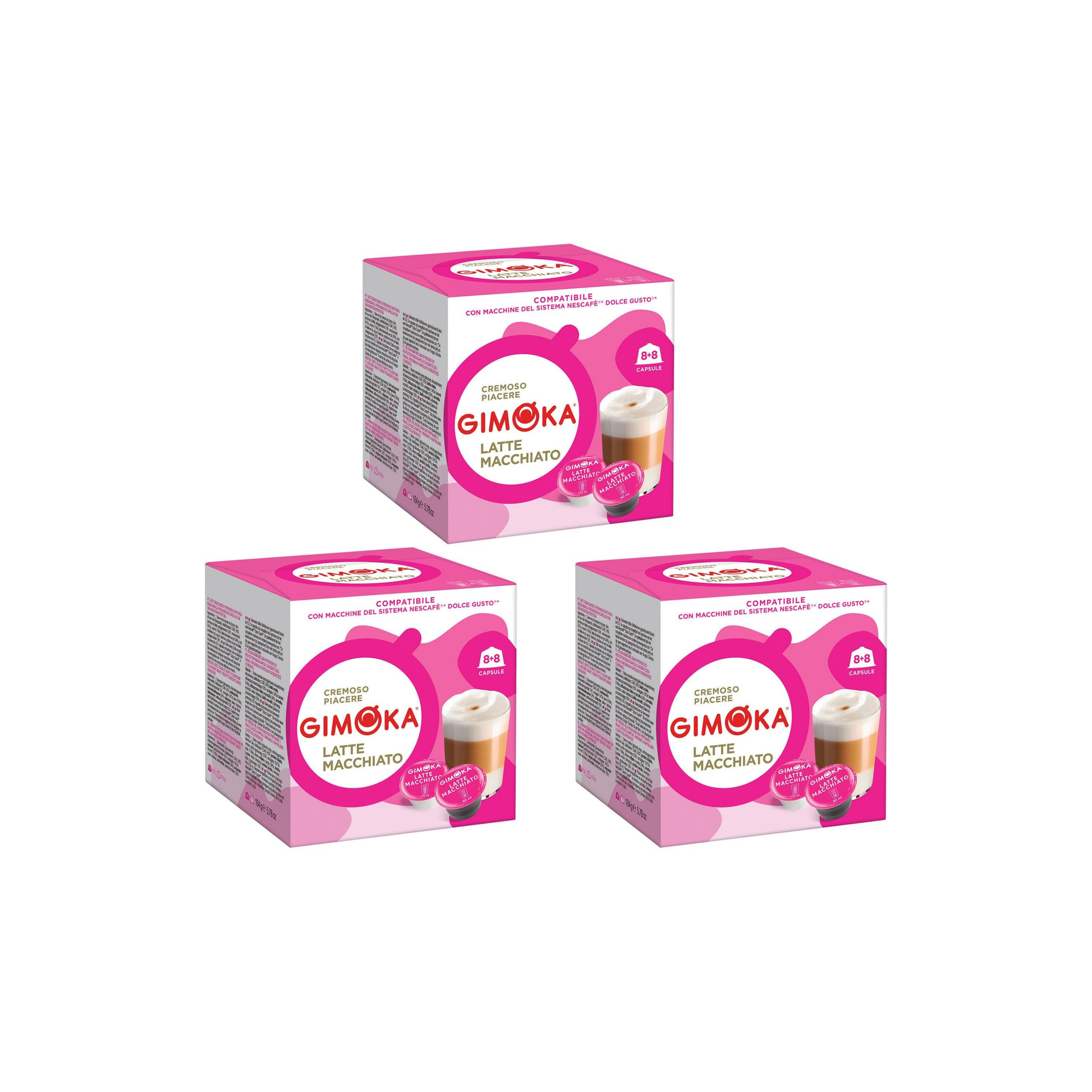 استمتع بمذاق لاتيه ماكياتو الإيطالي الأصيل مع Gimoka Latte Macchiato، الكبسولات المتوافقة مع Nescafé Dolce Gusto التي تمنحك طبقات مثالية من الحليب الكريمي والقهوة الاسبريسو الغنية.
